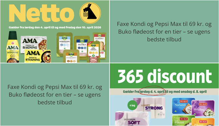 Netto har et godt tilbud på Faxe Kondi eller Pepsi Max sodavand. Du kan få en hel ramme med 24 x 33 cl til kun 69 kr. Tilbuddet gælder fra lørdag den 4. april til fredag den 10. april 2026.